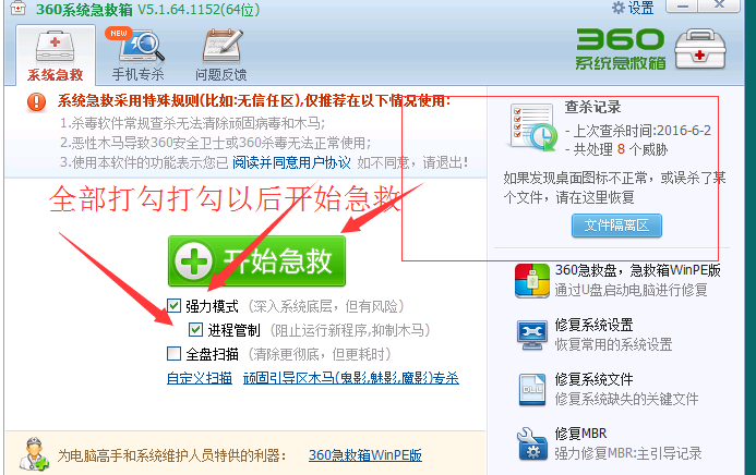 4.点击强力模式,在点下进程管制然后在点“开始急救”按钮。